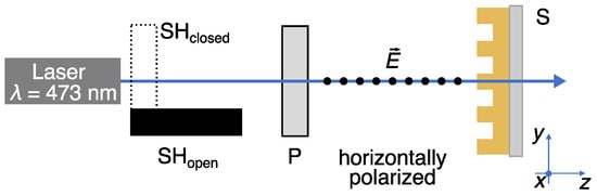 Schematic draw of the experimental setup. The linear polarization orientation along x-axis is ensured by a polarization filter P. The sample S was placed into a movable sample holder to align it in x-y-plane, which is perpendicular to the beam propagation (z-axis). The automated shutter SH was placed in front of the laser to block the laser beam after the illumination duration.