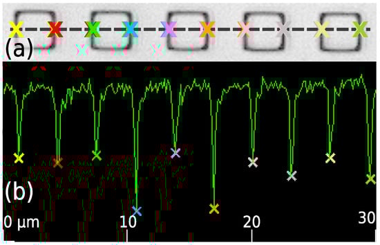 Exemplary images from the auto-measurement tool. (a) A laser micrograph of imprinted square structures with a drawn baseline to acquire the intensity profile. (b) Resulted intensity profile along baseline with marked intensity peaks as colored crosses to determine the w and l values.