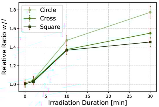 There was no significant change in the w nor in the l size for all three structures while the sample was exposed for 2 min. Upon a longer illumination time of 10 min all structures exhibit an increase of around 25% in size along the w-direction compared to their untreated size. After 30 min of irradiation, the circle structures were stretched nearly 60% in w-direction in comparison to the untreated size, whereby cross structures show an elongation of 38%. In contrast to the circle and cross, the square structures show a gain of 27 % in size after 30 min, compared to initial structure. As can be seen in the diagram (Figure 6), the elongation quantity for an illumination of 10 and 30 min is nearly the same.