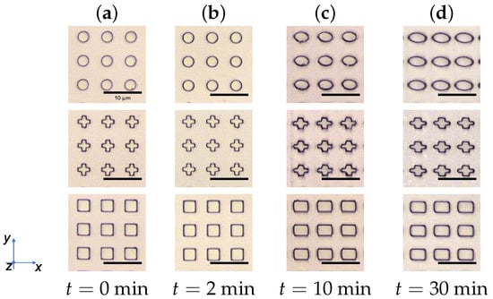While the w size increases upon illumination for 10 min, the l size shrinks by 10% for circle and square and 8% for the cross structures. On the other hand, the square structures show a negligible change in the w and l-direction comparing 10 min to 30 min of illumination. However, for the elongation in l-direction the circle and cross shaped structures shrink up to 18% after an illumination of 30 min. Due to the comparability, an irradiation duration of 10 min was selected for further investigation because a similar stretching ratio results at this point. Micrographs in Figure 7 visualize treated Azo30 structures after each illumination duration.