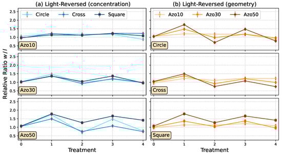 The ordinate shows the relative -ratio of the mean values corresponding to different concentrations (Azo10, Azo30 and Azo50) in (a) and each geometry (circle, square and cross) in (b). The abscissa shows the treatment steps (L0: untreated, L1: stretching for 10 min in w-direction, L2: stretching for 10 min in l-direction, L3: same as L1, L4: same as L2.