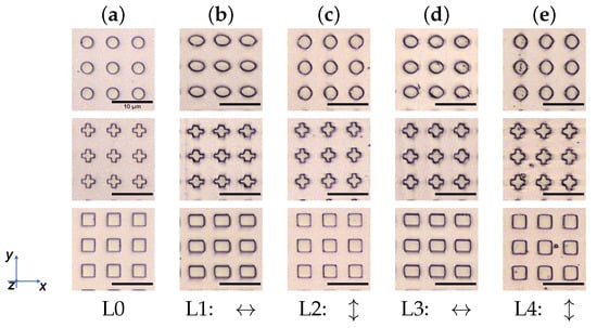 While there is no significant reversible stretching measurable for the Azo10 samples (Figure 8a, top), the Azo30 (a, middle) and Azo50 (a, bottom) samples show a clear behavior in stretching and restretching to the initial size. During treatment L3, the structures can be stretched by 20%, while for treatment L4 the initial geometry could be restored as it can be seen in Figure 8. Azo50 seems to be unsuitable for a controlled recovery of the initial size. Additionally, by illuminating the structures in step L2, the l-size extends while the w-size decreases for circle and cross. For square structures, the second treatment L2 seems insufficient to recover the structures completely. Irradiation during treatment L3 leads again to an increase in w-size up to 23% for cross and square and around 55% for circle structures. The treatment step L4 results in a similar behavior as in L2, whereby for all three structures the sizes remain similar. Even though, the structure types behave different in their reshaping, there is no clear geometry dependency visible for all samples (Figure 8b). Micrographs in Figure 9 visualize Azo30 structures after each treatment step.
