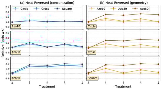 The ordinate shows the relative -ratio of the mean values considering each concentration (Azo10, Azo30 and Azo50) in (a) and each geometry (circles, crosses and squares) in (b). The abscissa shows the treatment steps (T0: untreated, T1: stretching for 10 min in w-direction, T2: heating at 120 °C for 5 min, T3: same as T1, T4: same as T2).
