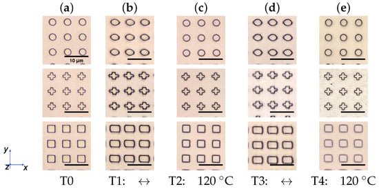 As already mentioned, the light-induced stretching can additionally be relaxed by means of temperature. Here, treatment steps T0, T1 and T3 (“T” for thermal-induced recovery) remain the same as for L0, L1, and L3, but treatment steps T2 and T4 are replaced by a temperature step. During these steps, the samples were heated at 120 C for 5 min to relax the stretched structures to the initial size. Again, the investigation of the reversibility results in a dependency on AZOPD-concentration (Figure 10). Micrographs in Figure 11 visualize Azo30 structures after each treatment step.