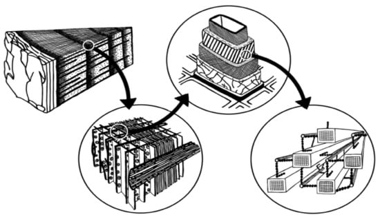 In contrast to other plants, wood is produced by a perceiving and adapting organism, that is, the wooden body in a living tree is able to carry liquid from the foundations up to the top and to maintain structural performance of the slender branch by absorbing bending stresses caused primarily by breeze [,]. This results in the creation of the complicated vertical wood structure, which has an assigned role that is individual to each body. Cell membranes that are compact and the reduction of the bridge cell interior hole area are the elements for attaining structural performance []. Figure 1 shows the different zoom elements of the hierarchical wood structure depicting the cell wall arrangement at the nanoscale.