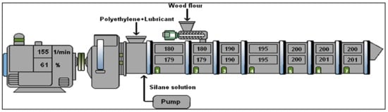 The characteristics of the composite materials have been studied in relation to a number of variables, including wood concentrations, coupling agents, as well as impact modifiers []. The first step was to parch the WF at a temperature of 50 °C for 12 h, resulting in a water content of 20–30% of the oven-dry particle mass. The WFs were indeed ground in a rotational grinder even without the addition of any extra water after parching. Since being ground to something like a fine powder, the WF was retained in a 60-mesh screen. WF was therefore desiccated in such a furnace at 100 °C with one day to remove the moisture (1–2%) before being used in composite fabrication. After that, a 60-mesh screen was used to collect the fine powdered WFs. Prior to fabrication, the WF was allowed to dry in a furnace at 100 °C for one day to eliminate any remaining water content of 1–2% []. Processed in a 30 mm co-rotating twin-screw extruder, the WF, matrix, and coupling agents had a length-to-diameter proportion of 30:1. For each zone, the barrels were kept at 170, 180, 185, or 190 °C. The extruder die was kept at a temperature of 200 °C. After being extruded, the samples were placed in a water bath as well as pelletized. Prior to actual processing, the pellets were deposited inside a closed bag and thereafter left to dry to a water content of 1–2% in an oven. First, from the feed region here to the die zone, samples were heated to 180–200 °C. Process time was about 20 s and pressure was 4–5 MPa with the specimens. As per ASTM D 618 standards, the specimens then seem to have been influenced at 23 °C as well as a humidity level of 50% [,].