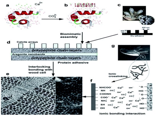(a,b,d) Synthesis of soy protein adhesives, (c,g) gecko and mussel adhesive proteins, (e,f) mechanical and ionic crosslinking mechanisms at the surface, Reproduced from [], Royal Society of Chemistry, 2017.
