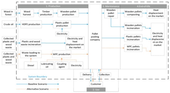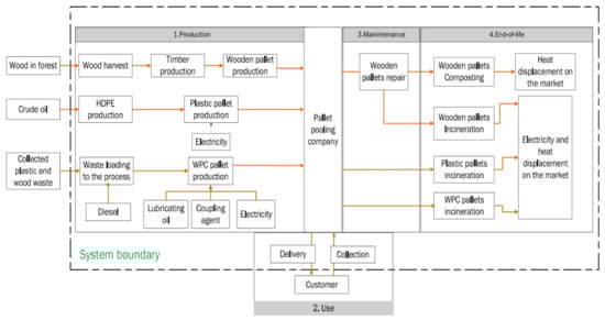- Khan, M.; Hussain, M.; Deviatkin, I.; Havukainen, J.; Horttanainen, M. Environmental impacts of wooden, plastic, and wood-polymer composite pallet: A life cycle assessment approach. Int. J. Life Cycle Assess. 2021, 26, 1607–1622. [Google Scholar] [CrossRef]