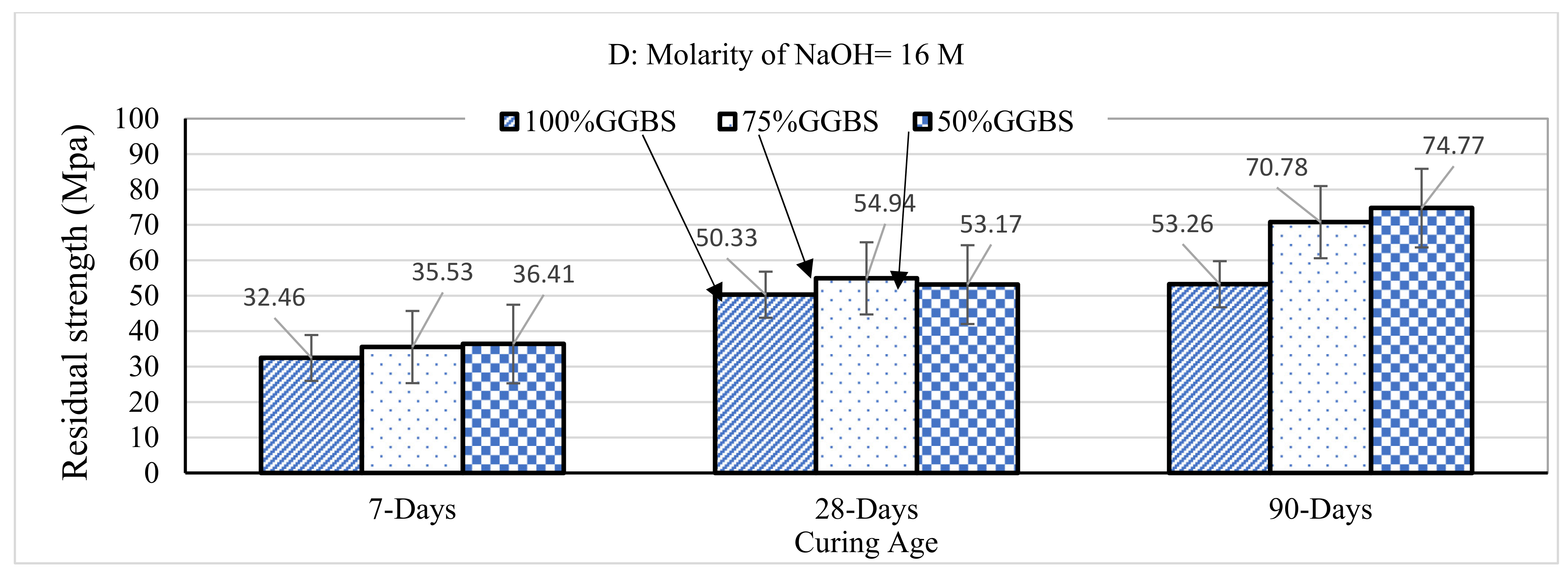 - The 50%GGBS+50%fly ash mix developed a high 90-day compressive strength of 86.74 MPa when NaOH concentration was 16 M, corresponding to the highest solution alkalinity in this study.