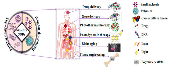 This study aimed to present advances in bioactive graphene quantum dot-based polymer composites, focusing on advances in bioactive GQD-based synthesis methods and highlighting future work areas in this field. These methods are based on techniques that rely on top-down or bottom-up processes: bioactive GQD synthesis, GQD green reduction, and GQD-based polymer composites. Finally, the applications of bioactive GQD-based polymer composites, including drug delivery, gene delivery, heat treatment, thermodynamic therapy, bioimaging, and tissue engineering, are discussed. The contents of this review are shown in Figure 1.
