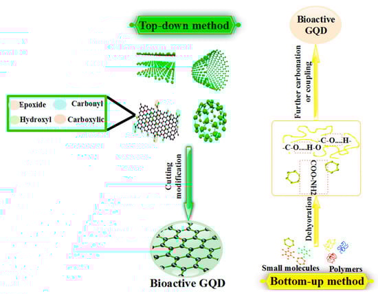 The top-down and bottom-up methods for the synthesis of bioactive GQDs.