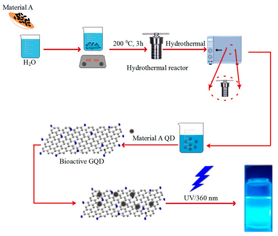 A fast and straightforward way to prepare bioactive GQDs is the hydrothermal method. The hydrothermal method is a one-step method in which the organic precursor is heated in a Teflon tube to reach high temperatures and pressures. As a result of high temperatures under high pressure, the bonds between carbon materials are broken to form bioactive GQDs. The electrical-optical properties of the particles can be adjusted by using different precursors and through temperature optimization. Therefore, the hydrothermal method is low-cost and non-toxic (Figure 3. Hydrothermal methods also produce particles with a diameter of 10 nm, more prominent than other dot production methods, such as the electrochemical method [120,121,122,123,124,125]. Lianget al. easily obtained highly fluorescent quantum dots from gelatin by using hydrothermal method [126]. Liu and colleagues developed a simple, green, and inexpensive way to prepare fluorescent quantum dots using hydrothermal processing and a type of radish. They investigated the application of prepared carbon quantum dots in cell imaging and the detection of iron ions [127]. Hong Miao et al. presented a green method for synthesizing carbon quantum dots with a high quantum yield of about 14% from tomato paste and investigated the use of synthesized quantum dots in determining the type of antigen [128].
