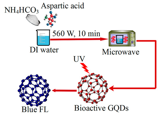 The synthesis of nanoparticles via microwave-facilitated methods has many advantages compared to other methods. Compared to the hydrothermal method, this method has the advantage of its higher speed and lower synthesis temperature. Some of the benefits of microwave facilitated reactions are: (1) Deficient level of impurities in the products, (2) a very high product efficiency, (3) the easy control of temperature and pressure, (4) the easy control of product properties (such as size), (5) the environmental friendliness of the method, (6) the very high security of the method, (7) its reproducibility, and (8) selective heating (i.e., the reduction of energy costs) [129,130,131]. Ayele et al. have proposed a green method for the mass production of CdSe quantum dots by using microwaves [132]. An easy, light, and fast method for the synthesis of nitrogen-doped GQDs using microwave prepared cedar tree root without surface modification has been proposed by Shawing Sheng et al. [133]. The resulting quantum dots were used to identify Hg2 + ions selectively. Synthesized GQDs can also be used as multicolor fluorescents in bioimaging. The purification of dialysis membranes for 7 h and the preparation of GQDs via microwave irradiation for 10 min using raw materials such as aspartic acid (Asp), NH4HCO3, and solvent (DI water) were investigated by Zhang et al. The results showed that the prepared GQDs had a strong blue fluorescence and a QY of 14% (Figure 4) [134].