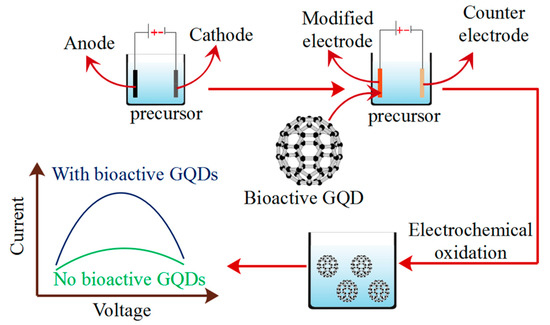 Electrochemical methods make it possible to adjust nanostructures by controlling the current–voltage ratio. For example, applying a regulated voltage to a bulk of carbon precursors leads to the electrochemical corrosion reactions of carbon reactants and the production of carbon nanostructures. This method does not require high temperatures; it can be done quickly on a large scale with aqueous or non-aqueous solvents. This method is one of the fastest ways of producing graphene sheets (Figure 5) [103,104,105,135,136]. For example, Paulo et al. prepared GQDs using electrochemical and corrosion methods [137]. Wong et al. proposed a bottom-up approach for synthesizing nitrogen-doped GQDs using the electrochemical process. This method is green and simple and is suitable for large-scale synthesis with an interest rate of more than 95%. The quantum gain of the particles is 0.71. Also, the toxicity of quantum dots synthesized by this method is low [138].