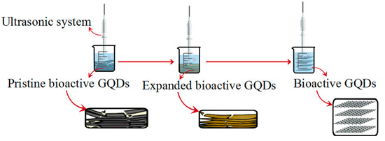 In recent years, many methods for making photoactive materials for use in solar cells and photocatalysts have been proposed. However, the benefits of preparing these materials in unusual ways are exciting from the point of view of green chemistry. The idea of producing highly efficient photocatalysts through the use of ultrasound is fascinating and essential in terms of science and technology and has excellent potential for producing photocatalysts in the near future. Ultrasonic synthesis is a promising method that allows for control over size, morphology, nanostructure, and catalytic properties. Compared to conventional energy sources, the supersonic method provides abnormal reaction conditions in the liquid phase due to the phenomenon of cavitation (very high temperatures and pressures for brief periods in liquids) [139,140,141]. Zhu et al. synthesized high-quantum GQDs from only graphene oxide and potassium permanganate in a one-step method using ultrasonic irradiation and used them as a test for the detection of alkaline phosphate (ALP) [142]. Oza et al. prepared GQD quickly and greenly using the precursor chemical acoustic method and a lemon [143]. The resulting quantum dots were purified using the sucrose gradient density centrifugation method, which separated the water-soluble, single-spray, photoluminescent, highly stable optical, and chemical quantum dots. Furthermore, quantum dots synthesized in this way are not toxic and can be used as optical imaging tools. The formation of tens of thousands of small bubbles in the liquid and the loss of carbon–carbon bonds are generated by mechanical force and eventually results in GQD cutting, an issue which is affected by ultrasound waves (Figure 6).
