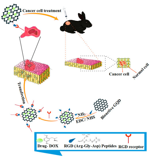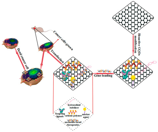 Gene therapy is one of the new and promising ways to treat various diseases caused by genetic disorders such as cystic tissue corruption, Parkinson’s disease, and cancer [244]. Figure 8 shows the treatment of cancer cells with gene therapy based on bioactive GQDs. Gene therapy for treating a wide range of disease conditions such as rare hereditary and single-gene disorders has also attracted much attention. For this purpose, nucleic acids must be delivered to human target cells and expressed. Gene therapy offers a new treatment method by offering DNA or RNA instead of chemotherapy drugs to inhibit cell pathways and induce tumor cell death. This treatment method can also remove a malfunctioning gene, replace the mutated gene, or offer new gene products to fight the disease [245,246,247]. Successful gene therapy requires a gene carrier that can protect DNA from nucleoside degradation and, in addition, facilitate high-yield DNA cell uptake [248]. The primary challenge facing the development of gene therapy is the lack of safe and highly efficient carriers [249]. Among the effective non-toxic carriers in gene therapy are none-viral gene delivery systems. Such systems ensure that nucleic acid payloads to cytosols and cell nuclei bypass biological barriers. Viral vectors are one of the factors influencing gene delivery due to their natural ability to invade and deliver genetic material. It is also possible to keep them safe for clinical use by blocking the immunogenicity of viral vectors [250].