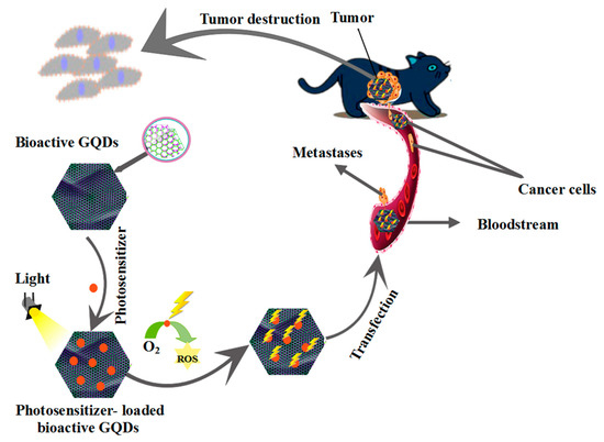 PDT activates a light-sensing compound by using visible light to generate samples of cytotoxic oxygen and free radicals that selectively destroy rapidly growing cells [268]. PDT is widely used to treat acne, psoriasis, and cancer using a light source and a light-sensitizing agent. Light sensitizing factors such as semiconductor quantum dots have received much attention in the context of PDT. The killing of target cells occurs via a PDT mechanism involving ROS production and oxidative stress. ROS production in cancer cells and tumors is mediated by a light-sensitizing agent such as a bioactive GQD-based polymer composite (Figure 10). The factors that make bioactive GQD-based polymer composites a good light sensitizing agent include stability in various pHs and light, their biological corrosion resistance, and their biocompatibility. To achieve PDT and the simultaneous imaging of cancer cells, bioactive GQD-based polymer composites can be used. The prevention of photobleaching and the production of a high quantum efficiency from a single oxygen molecule are among the benefits of bioactive GQD-based polymer composites. In PDT, bioactive GQD-based polymer composites are more practical than any other factor. The induction of cancer cell apoptosis and autophagy is performed by bioactive GQD-based polymer composites through oxidative stress.