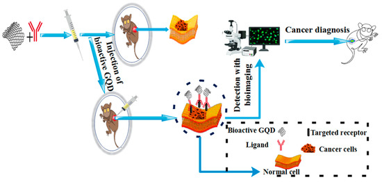 Bioimaging is a method used in both clinical and research settings. Using different parts of the electromagnetic spectrum means that the bio-distribution of therapies separately and accurately and the observation of biological processes such as targeted delivery provides cellular uptake [22,234,276]. The application of QDs in cell imaging is multicolored and sensitive due to a significant increase in their synthesis, surface composition, and chemistry [277]. The extensive application of bioactive GQD-based polymer composite in biological imaging are stimulated by broad absorption with narrow emission spectra, strong quantum confinement, and relatively high quantum efficiencies with high molar extinction coefficients [278,279,280]. Bioactive GQD-based polymer composites are promising candidates for imaging deeper tissue samples because they have the property of emitting near-infrared reflection [281]. Since the detection of metastasis and the recurrence of cancer, and the early detection of tumors by sensitive imaging, are possible, it can be said that the role of imaging in the diagnosis of cancer is of particular importance. Figure 11 illustrates the diagnosis of cancer using bioimaging based on bioactive GQDs. As required with other nanoparticle platforms, the intrinsic PLs of GQDs allow them to be used as optical probes in fluorescence imaging without the further combination of fluorescent dyes. Recently, the capabilities of bioactive GQD-based polymer composites in MR imaging and NIR fluorescence imaging have led to the development of bioactive GQD-based polymer composite in bioimaging. Among the unique features of bioactive GQD-based polymer composite, we can mention their ideal imaging probes, with applications in different bioimaging methods, and their excellent biocompatibility [256]. In Sheng et al., the doping of quantum dots with nitrogen (N-GQDs) was performed using a hydrothermal process. In this study, raw materials such as citric acid, PVP K90, and glutamate were used, and the quantum efficiency was 64.2%. The results showed that a new fluorescence probe of nitrogen-doped GQDs could be used to detect chromium (VI) and mark MCF-7 cells [282].
