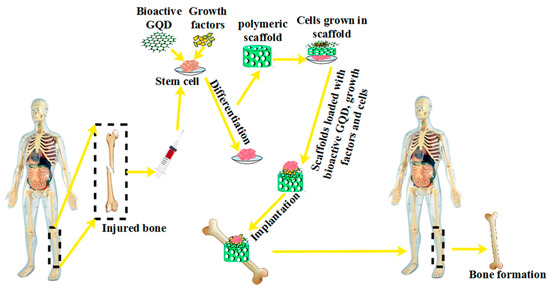 One of the most important aspects of polymer composites when it comes to obtaining lightweight materials with superior performance is the excellent mechanical and electrical properties that graphene imparts to polymer matrices. The outstanding properties that GQD-polymer composites possess with the introduction of only small amounts of nanofillers into the polymer matrix are still being considered [41,42,43]. Thus, research groups have made significant efforts to prepare GQD-polymer composites and study their properties [44,45,46,47,48,49,50]. Information on GQD-polymer composites, including the small size of GQD particles, their atomic rough surfaces, and the dispersibility in polymers have been obtained through simultaneous studies of their mechanical properties and thermal conductivity [51]. Graphene-bound biomacromolecules can improve the bioactivity and biocompatibility of advanced GQD-based biocomposites and nanoplatforms [52,53]. QD-based polymer composites on graphene base surfaces can provide significant biocompatibility and bioactivity, with many potential biomedical and medical applications [54,55,56,57]. Recently, graphene and bioactive GQD based polymer composites have been widely used in medicine for drug delivery, cancer treatment, tissue engineering, phototherapy, and stem cell and biosensor separation [58,59].