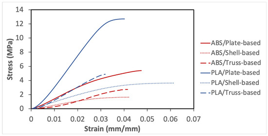 Figure 2 shows the compression stress–strain curves for the investigated LSs. The stress–strain curve provides the mechanical behavior of LSs and could help to find the Young’s modulus and yield strength. The main purpose of this test is to obtain the linear stress–strain limit so that the effective load, and strain levels can be identified for creep, stress relaxation, and cyclic loading-unloading tests. It can be observed that the overall compressive behavior of LSs depends mainly on its microstructural design and relative density, and the mechanical properties of the base material. Generally, the higher the density, the higher the collapse stress. As defined early, PLA has a higher density than ABS, 1.25 and 1.03 g/cm3, respectively. Therefore, the fracture stress of the PLA samples is higher than that of the ABS specimens, as illustrated in Figure 2. With regards to the effect of the architected structural member geometry, it is evident that plate-based lattices are stiffer than others, followed by truss-based lattices then shell-based lattices made of the same material and relative density.