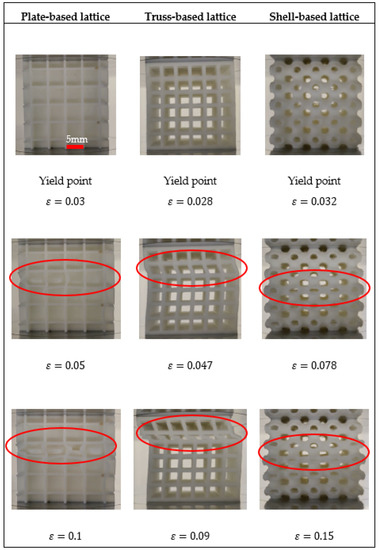 We investigated the architected structural member geometry on the deformation mechanism. All the three structures were deformed under uni-axial compression and representative pictures were taken during the tests at different strain levels as presented in Figure 3. Noticeably, there is no physical failure in the identified yield point as shown in the 1st row in Figure 3. Moreover, it was observed that buckling occurred when compressive strain reached to some critical value and consequently led to rapid and dramatic changes of the material microstructure, as illustrated in the 2nd row in Figure 3 (in which all three structures demonstrated clear buckling). Subsequently, the middle region of structural members reached to a completely collapsed and then the deformation progressed to the neighboring cells. The plate-based lattice deformation occurred by compressing layers over each other, while truss-based lattice deformed due to buckling of its struts, whereas shell-based lattice deformed by squeezing its unit cells.