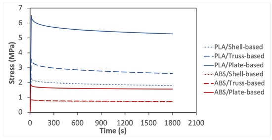 The stress relaxation experiment was undertaken according to the procedure explained in above methodology section. Equal effective strain was applied in each sample made of the same material, based on the outcomes of quasi-static compression test, the elastic limit of PLA samples is higher than ABS samples. Therefore, PLA samples experienced higher initial stress than ABS, as shown in Figure 4.