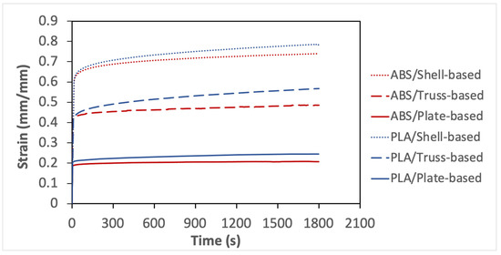 The creep experiment was conducted following the procedure discussed earlier in the methodology section. The data obtained from the creep test are plotted in Figure 5. The shell-based lattice experienced the highest initial strain level, while the least value of applied strain belongs to the plate-based lattice. Those results are because all samples made of the same material have compressed to the same effective stress level and conform to the conclusions of previous experiments. The shell-based lattice was the compliant, while plate-based lattice was the stiffest.