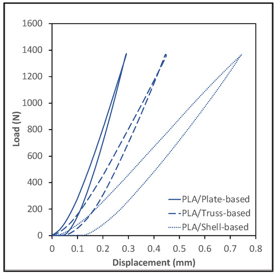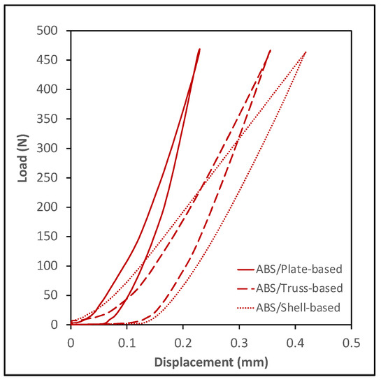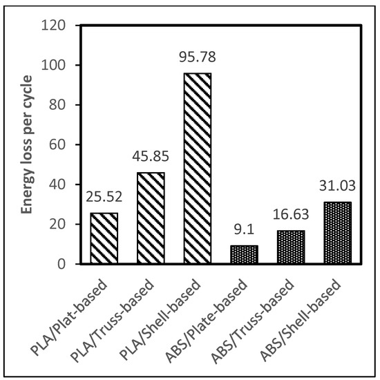 The compressive cyclic loading experiment was conducted following the procedure described in the methodology section. Figure 6 and Figure 7 show plots of the load vs. displacement values for ABS and PLA samples. All tested specimens demonstrated a viscoelastic behavior and formed a hysteresis loop. The shape of the hysteresis curves dictates the energy dissipation capacity of LSs. The samples can be ranked by estimating the area inside the hysteresis loop; the wider loop means the better damping performance, energy dissipation capacity, or viscoelastic behavior. Figure 8 shows the estimation of the area of the hysteresis loop for all samples, which was calculated using OriginLab software. The results show that the shell-based lattice has a wider hysteresis loop, then the truss-based lattice and the plate-based lattice, respectively. Thus, the shell-based LS exhibits the greatest energy dissipation performance. This phenomenon shows that the energy dissipation of a hysteresis loop increases with the growth of the displacement as the PLA samples were compressed to a displacement level higher than that of the ABS samples, as illustrated in Figure 8.