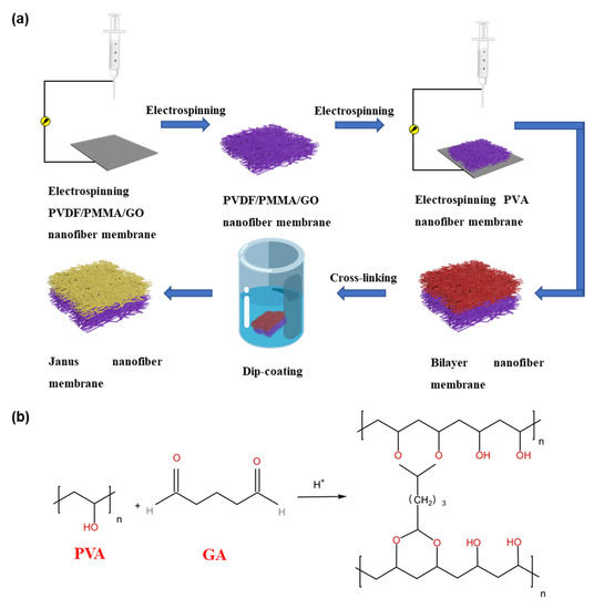 A conventional electrospinning device was used in this work, which was composed of three main parts including the propulsion device, high voltage power supply and collector. Initially, 1.2 g PVDF and 0.3 g PMMA were dissolved in a mixture of 6.8 g DMF and 1.7 g acetone. Then GO dispersion with the mass fraction of 0.8%, 1% and 1.2% was added, and magnetic stirring was used at room temperature for 4 h to dissolve and mix uniformly. Then, the PVDF/PMMA/GO solution was obtained. At the same time, PVA solution was prepared—1.2 g PVA was dissolved in 8.8 g deionized water to obtain 12 wt% PVA solution, and magnetically stirred at 70 °C for 4 h to fully dissolve it. The schematic diagram of the Janus membrane preparation process is shown in Figure 1a. The PVDF/PMMA/GO solution was electrospun at a working voltage of 22.5 kV, the spinning rate was 0.5 mL h−1, the distance from the needle to the collector is 11 cm, and the spinning time was 3 h to obtain the PVDF/PMMA/GO fiber membrane. Then the PVDF/PMMA/GO fiber membrane was used as the collector in the preparation of the PVA fiber membrane by layer-by-layer electrospinning. The working voltage was 20 kV, the spinning rate was 0.66 mL h−1, the distance from the needle to the collector was 12 cm and the spinning time was 3 h to form a composite membrane. Then the PVA fiber membrane was coated onto the PVDF/PMMA/GO fiber membrane. The obtained membrane was dried in an oven at 60 °C for 12 h. The detailed process of cross-linked PVA (cPVA) is shown in Figure 1b. After that, the membrane was immersed in the crosslinking solution with GA as the crosslinking agent and hydrochloric acid as the crosslinking catalyst for 10 min [37]. Then the membrane was washed several times with 1% potassium dihydrogen phosphate solution, and dried at room temperature for 24 h. Finally, the Janus membrane was obtained.