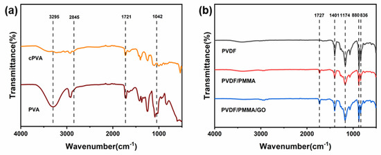 FTIR spectra of (a) Janus cPVA nanofiber membrane (hydrophilic side), (b) PVDF/PMMA/GO fiber membrane (hydrophobic side).