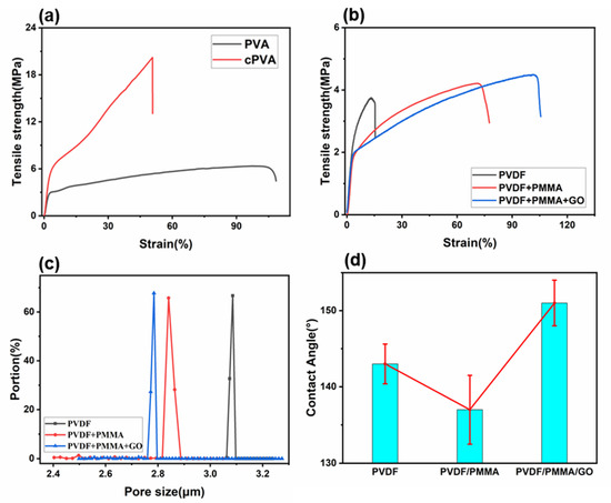 Here, we prepared a kind of Janus membrane with excellent mechanical properties. In order to test the tensile properties of the fiber membrane, the Janus composite membrane was tested by a material testing machine. The maximum tensile stress and ultimate strain of PVA electrospun fiber membrane are 6.35 MPa and 108.38%, respectively, as shown in Figure 4a. After crosslinking, the maximum tensile stress of the cPVA membrane increased to about three times of the original data, reaching 20.21 MPa, and the tensile strain decreased to 50.72% (Figure 4a). The increase of the maximum tensile stress indicates that the mechanical properties of the PVA nanofiber membrane are significantly improved by crosslinking. Therefore, the crosslinking of PVA greatly improves the mechanical properties of the material. As shown in Figure 4b, it can be clearly seen that compared with pure PVDF, the elongation at break of the fiber membrane is greatly improved after adding PMMA, which can be attributed to the decrease of crystallinity of PVDF and the decrease of the brittleness. At the same time, the tensile stress of the composite membrane is also improved after adding PMMA [51]. On this basis, the mechanical properties of the fiber membrane with 1% GO dispersions were tested. It can be seen that the elongation at break and tensile stress are improved. The addition of GO improves the surface roughness of the fiber, increases the friction between fibers and makes fiber fracture difficult, thus improving the mechanical properties of the nanofibers.