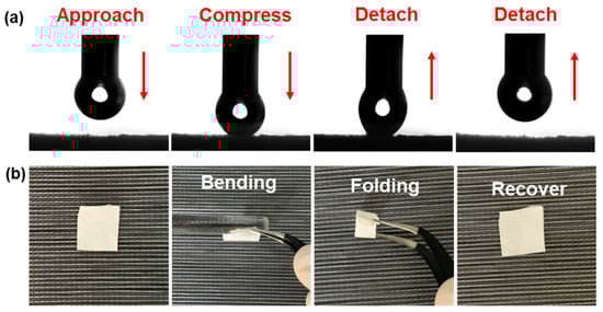 The addition of GO significantly reduces the surface energy of the sample, thus improving the hydrophobicity of the fiber membrane. Through the contact angle test, it is found that the PVDF/PMMA/GO layer has very low adhesion (Figure 6a), which further proves its strong hydrophobicity. In addition, Figure 6b shows the superior mechanical flexibility of the Janus membrane, which will not break after bending and folding, and can still be restored to the original state, showing that the prepared Janus membrane has excellent mechanical properties.