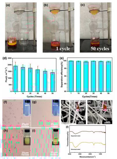 In this work, the two sides of the Janus membrane show superhydrophilicity and superhydrophobicity, which provide a good basis for oil-water separation. The prepared cPVA-PVDF/PMMA/GO Janus membrane was placed on a filtration device to study the oil-water separation performance, as shown in Figure 7a. Its performance was tested with n-hexane and deionized water; pouring the oil-water mixed solution into the funnel through the prepared Janus membrane. After a period of time, it can be clearly seen that all the oil flows through the Janus membrane into the beaker below. On the contrary, all of the water solution is blocked above the fiber membrane by the composite membrane (Figure 7b). This proves that it has a broad prospect in oil-water separation. In addition, the separation efficiency and durability of the Janus membrane were tested. After many oil-water separation tests, it can be seen that the Janus membrane still maintains good oil-water separation performance, and the quality of n-hexane has almost not reduced (Figure 7c). The water flux of the Janus membrane is calculated by Equation (1) and the results are shown in Figure 7d, and the flux in the process of oil-water separation can reach 1909.9 L m−2 h−1. Figure 7e shows the change of separation efficiency with the increase of separation times. It can be seen that the separation efficiency of the Janus membrane has almost not changed. The experimental results show that the Janus membrane has stable performance and high separation efficiency after several cycles. At the same time, the separation performance of the Janus membrane was further tested with water-in-oil emulsion and water-in-diesel emulsion, as shown in Figure 7f–i. The separation results can be clearly seen by optical microscope photographs, indicating that the Janus membrane can effectively separate the water-in-oil emulsion and water-in-diesel emulsion. These results not only proved the separation effect of the prepared Janus membrane, but also showed the stability of its structure, forming a highly stable and reusable membrane. By testing its absorption peaks every 50 nm wavelength by UV spectrophotometer, it is found that the spectral absorption peaks of deionized water and separated water hardly change at different wavelengths, which proves that the separation of the Janus composite membrane will not cause pollution to it. Figure 7j and k shows SEM images of the dried hydrophilic layer and the hydrophobic layer of Janus membrane after separation, and it was found that the morphology of fibers did not change. Additionally, Figure 7l depicts the FTIR spectral data of deionized water and water separated by Janus composite membrane. In the water samples before and after separation, the strong peak at 3220–3550 cm−2 indicates the presence of the O-H group. Through comparison, it can be concluded that the Janus membrane has no pollution in the separation process [59]. Here, we also list the results of other similar works in Table 4 to compare with this work. We found that the prepared cPVA-PVDF/PMMA/GO Janus membranes by layer-by-layer electrospinning have obvious advantages in flux and separation efficiency. In this way, this work provides a simple and novel strategy to solve the problem of oil-water separation.