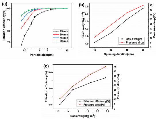 (a) Filtration efficiency curve of different hydrophilic layer spinning time (15–60 min), (b) relationship between spinning duration and basic weight and pressure drop, (c) relationship between basic weight and efficiency and pressure drop.