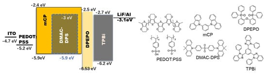 9. Gan, L.; Gao, K.; Cai, X.; Chen, D.; Su, S.J. Achieving Efficient Triplet Exciton Utilization with Large Delta EST and Nonobvious Delayed Fluorescence by Adjusting Excited State Energy Levels. J. Phys. Chem. Lett. 2018, 9, 4725–4731. [Google Scholar] [CrossRef]