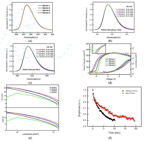 The normalized EL spectra of devices 1–4 at the same brightness are shown in Figure 2a, and the changes in the EL spectra and CIE coordinates of devices 1 and 4 at different current densities are shown in Figure 2b,c. It can be seen that the spectra of these devices were stable. As shown by the J-V-L curves (Figure 2d), the current density and luminance of device 2 were higher than those of contrast device 1 at first, and then decreased. The increase in current density at low voltage led to the improvement of efficiency; the main factor was the increase in electron injection, which was evidenced by the higher electron current of the electron-only device, as shown in Figure 3b. When the PEDOT:PSS layer was processed by PSVA, as in device 3, the current density increased, but the luminance and efficiency, especially at low voltage, decreased significantly. This was because the conductivity of the PEDOT:PSS layer increased after PSVA treatment, and the injection barrier of the holes and work function reduced [17], resulting in an increase in hole current of device 3 at low voltage, which was confirmed by the corresponding current result shown in Figure 3a. Nevertheless, after the increase in holes, there were not enough electrons to match them to form excitons, leading to more quenching and lower current efficiency. The current density of device 4, in which both the PEDOT:PSS and EML treated by PSVA clearly decreased, and the highest brightness levels increased, the maximum luminance was 1638 cd/m2, which means that both carriers injected effectively and mostly balanced. It can be seen from the CE-L and EQE-L (Figure 2e) that the current efficiency of device 4 increased and the degree of efficiency roll-off reduced from 33.3% to 26.6%. The charge balance improved the device’s stability, reduced exciton quenching and improved the device’s lifetime (which was tested in air). Specific data results are listed in Table 1.