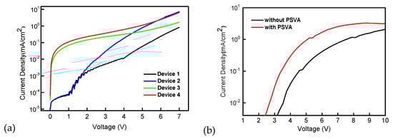 It is clear that in the hole-only devices, as shown in Figure 3a, the current density of device 3 and device 4 started to increase when the voltage was less than 1 V, indicating that a small number of holes was injected through the PEDOT:PSS layer processed by PSVA to lower the work function, thus reducing the hole injection barrier, which is consistent with previous research results [17]. However, under low bias, the current form of device 2 was the same as that of device 1. These results mean that the injection of holes under low bias is dominated by the properties of PEDOT:PSS. Under high bias, the hole current of device 2 increased greatly compared with device 1, which was consistent with the difference between device 3 and device 4. This shows that the hole current is dominated by EML under high bias. If EML was processed by PSVA, the hole current increased obviously. In addition, the electron current, as shown in Figure 3b, also increased and the initial injection voltage appeared to decrease after EML treatment by PSVA. Therefore, it is concluded that PSVA processing can improve the mobility of holes and electrons in the EML and improve their injection at the same time.