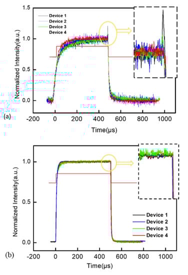 The transient EL intensity of four devices at the same current density is shown in Figure 4. For the transient measurement, we set the pulse signal period to 1 ms and the forward bias duration to 500 us to ensure that the luminescence of all the devices would reach a steady state. The luminance of the devices at a low current of 4 mA/cm2, as shown in Figure 4a, are determined by the number of injected carriers. Traps in devices capture carriers until traps are filled. Carriers then combine to form excitons for radiative emission. If there are enough injected carriers and low-density traps, the number of carriers used to form excitons in EML for luminescence quickly reaches a steady state; therefore, the time taken for the luminescence to reach a steady state is greatly shortened. According to the response time of the rising edge, device 4 reached the luminescence steady state fastest, which means that device 4 had a lowest trap density among all the devices; consequently, more carriers could recombine more quickly for emission. Therefore, the amount of charges, stored by the traps inside device 4, that was required to form polarons was smaller, which resulted in a decreased probability of charge quenching and improved efficiency roll-off. The second-fastest time taken to reach the electroluminescence steady state, behind device 4, was that of device 2. This is consistent with the J-V-L curve. The EMLs in both device 2 and device 4 were treated with methanol vapor annealing. At low current density, electrons are minority carriers. PSVA improves the quality of EML, as well as improving the electron injection and transport. Therefore, electrons can be injected into EML more effectively and recombine with holes at low current density. When the forward bias was switched, a sudden change in the electric field would cause trapped charges inside the devices to be released, which was reflected in the TREL test as an overshoot intensity signal. Devices 1 and 3 without PSVA-treated EML showed a strong overshoot, which was due to the electrons accumulating at the interface flooding into the EML after the forward bias was switched. In particular, untreated device 1 had the largest overshoot due to the significant accumulation of electrons and holes at the interface. After the PEDOT:PSS was treated with PSVA in device 3, the accumulation of holes between the EML and PEDOT:PSS layer decreased; consequently, the overshot decreased in turn.
