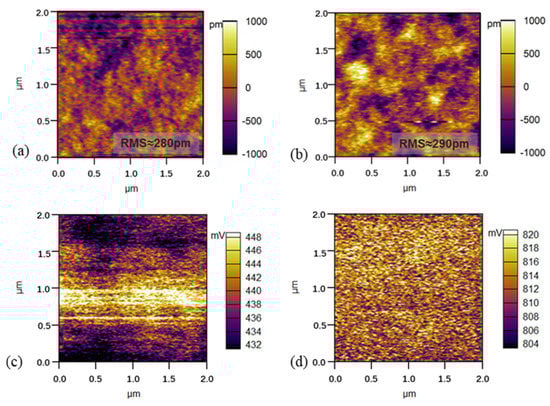 Figure 5. AFM images of (a) EML without PSVA, (b) EML with PSVA; SKPM images of (c) EML without PSVA, (d) EML with PSVA.