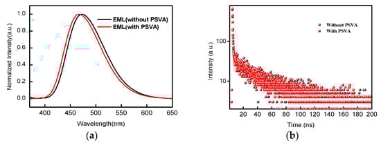 Figure 6. (a) PL spectra of mCP: 20 wt% DMAC-DPS films with or without PSVA; (b) transient PL decay of mCP: 20 wt% DMAC-DPS films at room temperature.