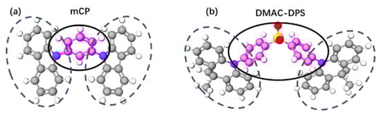 Figure 7. The molecular structures of (a) mCP and (b) DMAC-DPS. The part marked by the solid line represents the distribution of the molecular LUMO, the dotted line represents the distribution of the molecular HOMO.