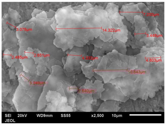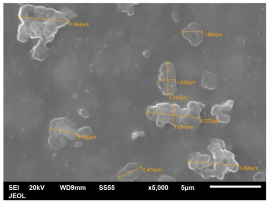 The particle shape of the aluminium Al flakes is depicted in Figure 2 and Figure 3. Unlike platelet minerals such as mica, the Al platelets did not have any recognisable regular polygonal shapes (rectangular, circular, hexagonal, square, rhombus, etc.). The width of the platelets was in the range of about 2–15 μm, with an average of ~5 μm. The Al platelets had an irregular contour (Figure 3), with rounded edges, instead of the sharp corners found with mineral platelets. The lack of sharp edges is beneficial, as it reduces stress concentrations. The manufacturer’s data sheet did not indicate the thickness, and it could not be deduced from the laser light-scattering measurement for particle size in Figure 1. It was difficult to estimate the thickness directly from the powder, as most flakes lay flat, and edge-on dispositions (Figure 2) showed clumping. The platelet thickness could be measured more accurately from the flakes embedded in the PET composite (to be shown later). The thickness of the platelets (obtained from measurements on the composites) lay in the range of 50 to 80 nm. The manufacturer has labelled this as a micro-Al powder; however, since one dimension is in the low-nm range, these Al platelets can be classified as a nano material. They are closer to nano platelet materials such clays and graphene than they are to mica and talc.