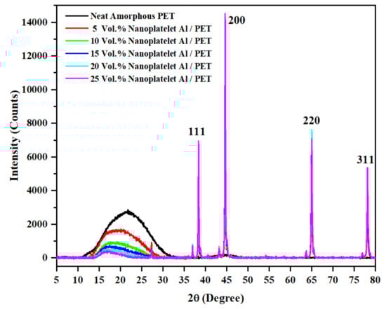 Wide-angle X-ray diffractogram of the nano platelet Al–PET composites. The broad peak at 2θ values between 11° and 33°confirms that the PET is in an amorphous state in the bars. The tall sharp peaks are from Al and the Miller indices are indicated. The small sharp peaks at 2θ ~27°, 37°, 44°, 64°, and 77° are artefacts.