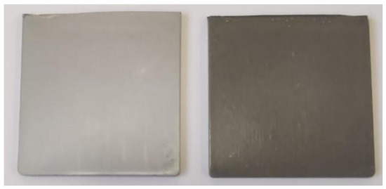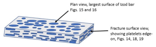 One effect of the Al particle’s shape was in the appearance of the moulded bars and plaques. Bars and plaques of amorphous PET moulded with Al platelets here were silvery, unlike those made with irregular, nodular Al in the previous work [41], which were dark grey (Figure 5). The silvery appearance of the Al platelets was due to them orienting parallel to the surface of the bars and plaques, giving enhanced specular reflection (the orientation tendency will be proved by microscopy).