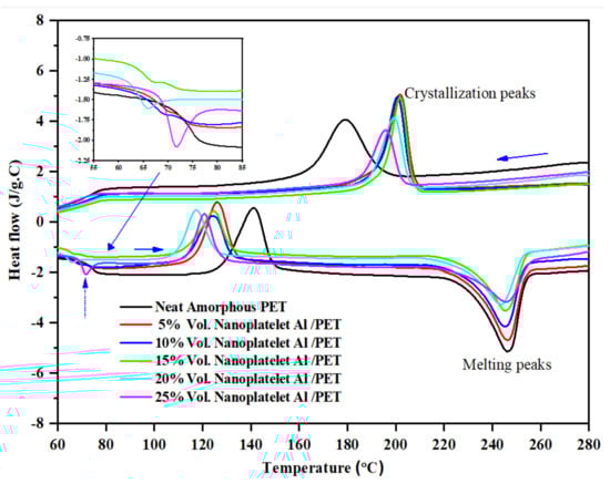 Effects (2) and (3) indicate that the Al nano platelets act as nucleating agents for the crystallisation of PET from the glassy state and also from the melt. This was observed also with the nodular (irregular) Al particles previously, and hence, in this regard, the Al particle’s shape shows no major effect [41]. Other fillers also show similar nucleating effects.