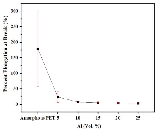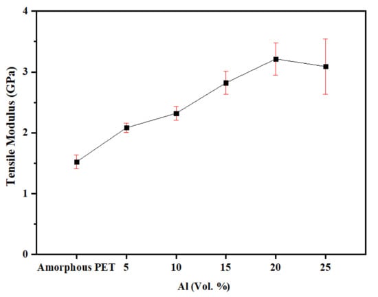 The values of the tensile modulus and tensile strength, and the elongation-to-break of the Al platelet–PET composites, as a function of Al loading levels, are shown in Figure 7, Figure 8, and Figure 9, respectively. The tensile modulus increased continuously with an increase in Al loading, and the variation was low. At 25 vol.% of Al, the modulus had doubled (Figure 7). This level of increase is generally observed when any rigid filler added to a rigid plastic matrix.