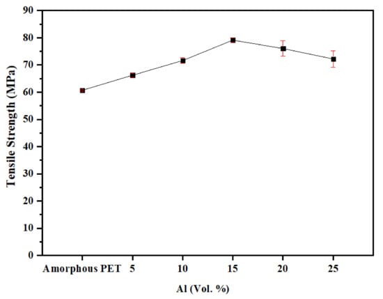 The tensile strength of the unfilled amorphous PET was 60.7 MPa (Figure 8). We are aligned with the literature values (56 MPa in Aravinthan and Kale [43] and a little under 60 MPa in Novello et al. [44]), and differences in testing rate and the PET’s I.V. do not make much difference. Figure 8 shows that the tensile strengths of PETs containing the Al nano platelets were higher than the amorphous PET. The tensile strength increased from 60.7 MPa to 79 MPa at 15 vol.% of Al flakes. The tensile strength appeared to reach a maximum and levelled off beyond 20 vol.% of Al, but it did not drop below the base polymer. The standard deviation for the tensile strength was low; hence, one can conclude that the addition of Al nano platelets does not cause a drop in strength, but, in fact, increases it. This is unusual, as in most cases of filler composites, the strength decreases with filler content [26,27,45,46].