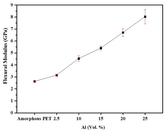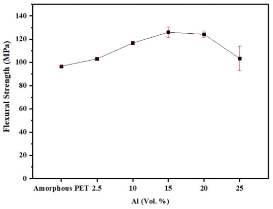Figure 11 indicates that the flexural strengths for the amorphous PET composites with Al nano platelets lay in the range of 100–120 Mpa. Generally, they were higher or were comparable to the base amorphous PET (flexural strength of 96.7 Mpa). At some loadings of Al platelets (15 and 20 vol.%), there was an increase of ~25% in the flexural strength. The variations in both the flexural moduli and flexural strengths were low, except for the highest loading, where aggregation might affect the result.