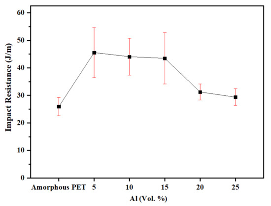 The comparison of the notched Izod impact resistance of amorphous PET with and without platelet Al as a function of Al loading levels is shown in Figure 12. The notched Izod resistance value we found for the amorphous PET was 25.9 J/m. Aravinthan and Kale [43] reported a value of 25 J/m.