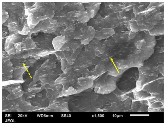 Figure 10 shows that the flexural modulus increased and reached a value of 8 GPa at 25 vol.% of Al platelets. With nodular (irregular) Al particles in PET, the highest flexural modulus reached was 3.24 GPa at 15 vol.% [41]; with the Al nano platelets here, at 15 vol.%, the value was 5.41 GPa. Polymers filled with 40 vol.% of short glass fibres reached flexural moduli of 9–10 GPa. The tendency for orientation of the nano platelets parallel to the largest surface of the bar (shown later in the SEM pictures) no doubt contributes to the increased flexural modulus. We could not find a parallel in the literature of platelet-composites where values of flexural moduli as high as 8 GPa were obtained. Table 4 collects some literature data on PETs filled with other platelet fillers (talc, nano mica, graphene and graphene oxide, calcium terephthalate). It can be seen from Table 4 that the combination of increased tensile modulus with increased tensile strength, increased flexural modulus, increased flexural strength, and increased impact resistance is only obtained with Al–PET. With graphenes and clays, higher loadings than 5–10% do not appear to be feasible due to the rise in viscosity, and the loadings in the 1–10% range bring a modest increase in some mechanical properties but at the expense of others, and the cost also makes it impractical. Shim et al.’s work (Table 4) involved taking graphene oxide (itself made from graphene), functionalising the graphene oxide further, and then solution-blending it with PET at very low dilutions. They [48] showed an increase in modulus and strength with addition of 0.5 wt.%, and even an increase in the elongation-to-break of the composite, but puzzlingly, their base PET had the lowest values of modulus and strength in the literature (modulus of 0.49 GPa for PET, whereas most authors show a value of 1.5–2.9 Gpa and a strength of 32 MPa, instead of ~60 MPa shown by all others, Table 4). After incorporating functionalised graphene oxide by solution-blending [48], Shim’s highest modulus was only 0.79 GPa (that is, below the value of unfilled PET found by all others) and the highest strength was 60 MPa (that is, the same as unfilled PET found by others, Table 4).